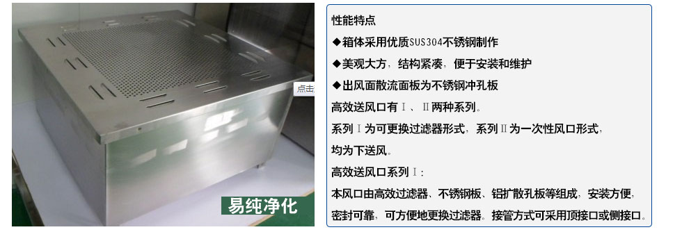 高效送風(fēng)口為千級、萬級、十萬級凈化空調(diào)系統(tǒng)較為理想的終端過濾裝置,可廣泛于醫(yī)藥、衛(wèi)生、電子、化工等行業(yè)的凈化空調(diào)系統(tǒng)。高效送風(fēng)口是用作改造和新建1000-300000級各級潔凈室的終端過濾裝置,是滿足凈化要求的關(guān)鍵設(shè)備。高效送風(fēng)口包含靜壓箱,散流板,高效過濾器,與風(fēng)管的接口可為頂接或側(cè)接